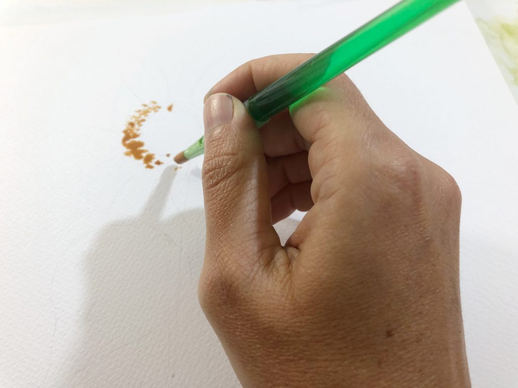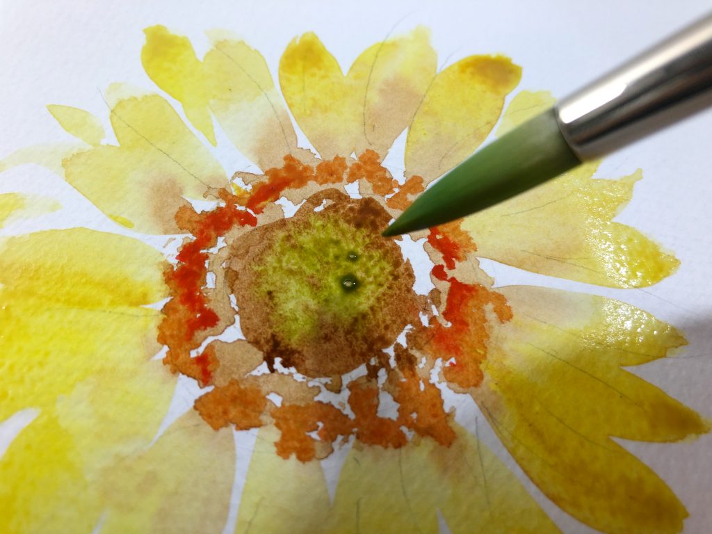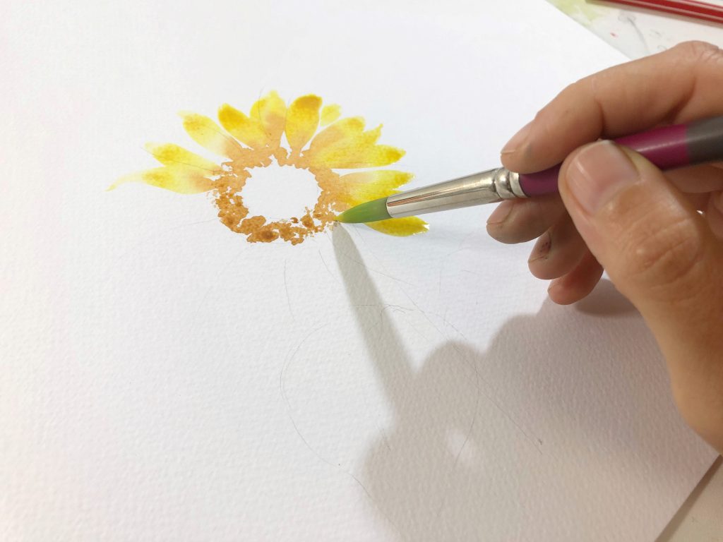 Using a stipple brush, or even a cheap brush and cut the bristles shorter. I begin dabbing the brown in a circle, creating the outer edge of the sunflower face. I’m careful to use a fairly wet mix here, so it doesn’t dry too quickly.