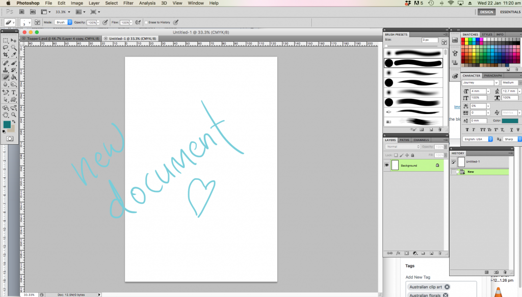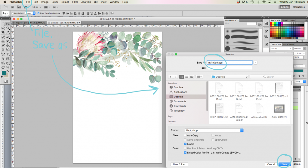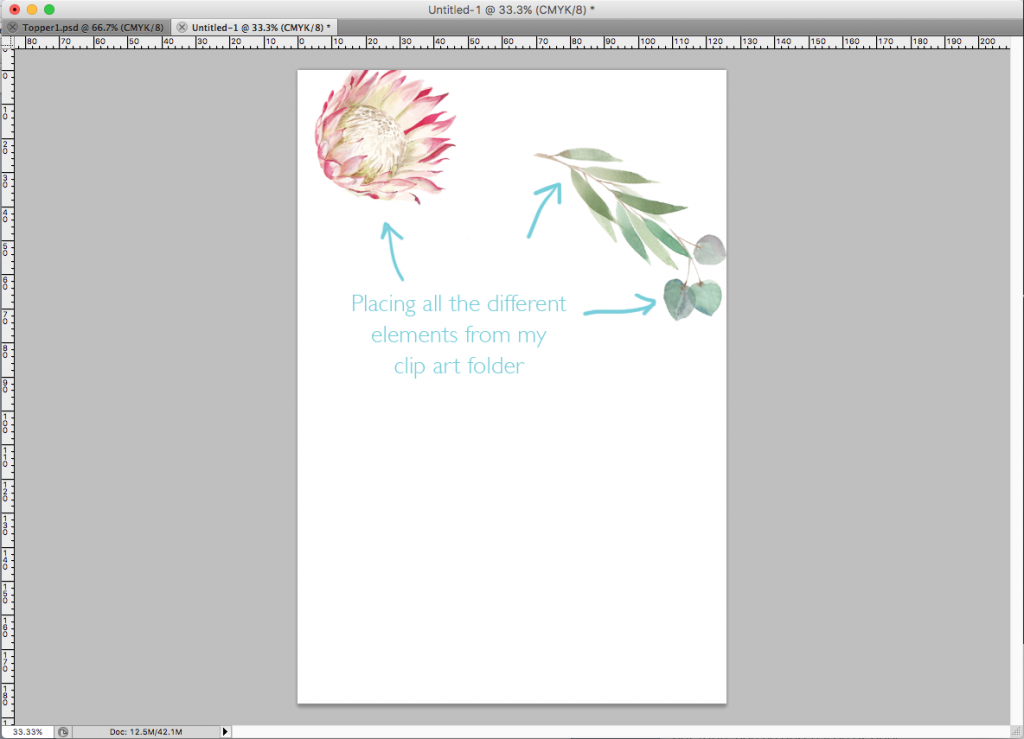 The first thing I’m going to suggest is you get yourself Adobe Photoshop, InDesign or Illustrator to work with. Personally, I create the floral parts of my invitations in Photoshop, and then the layout and text in InDesign. I’m sure you can use another program, however I’m going to focus on Adobe today, as that’s all I know really.