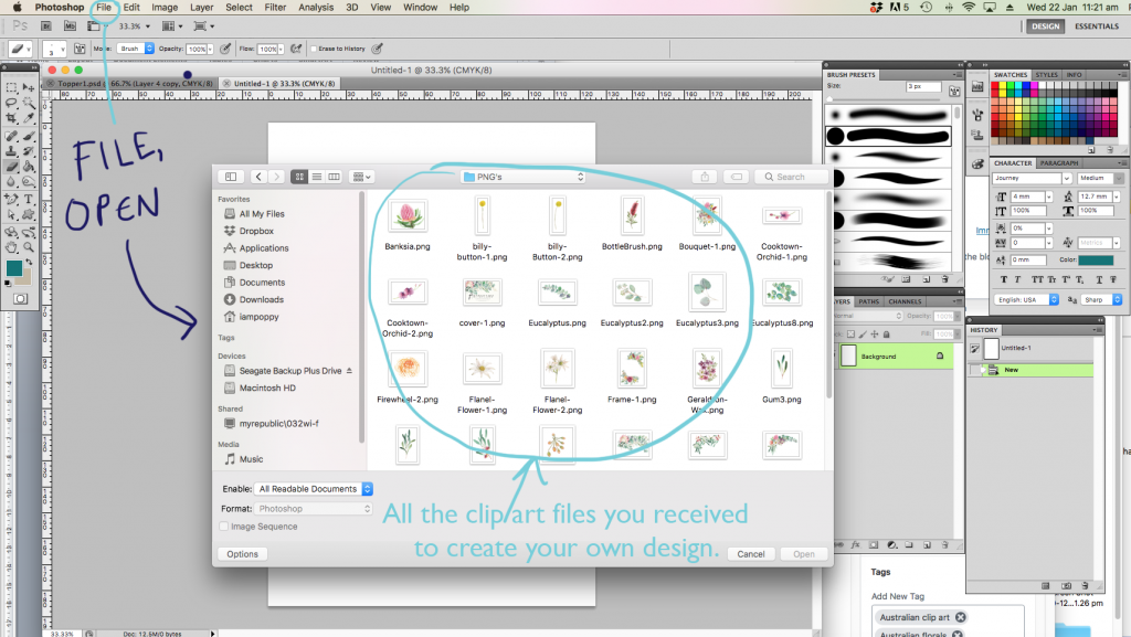 You will also need to download a set of watercolour clip art files. You can find some FANTASTIC ones here, on my website, or you can head over to Creative Market to find other options. These usually download in a ZIP file, which you will then need to expand, to which you’ll be greeted with a collection of JPEG, PNG files or Photoshop files.