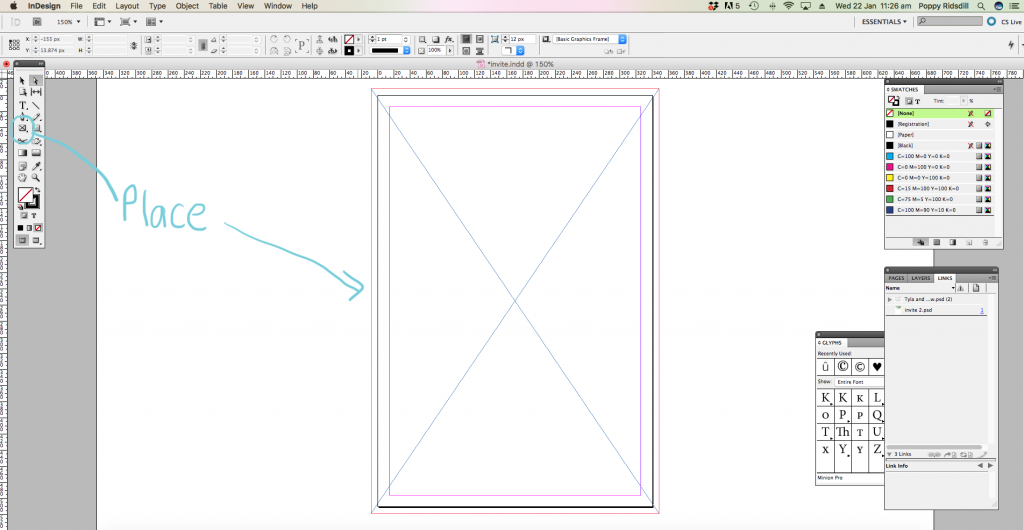 In order to PLACE your invitation file, head to the little box symbol on the tool bar, click and drag to the size you want it, and press Command D to take you to your files to choose your image.