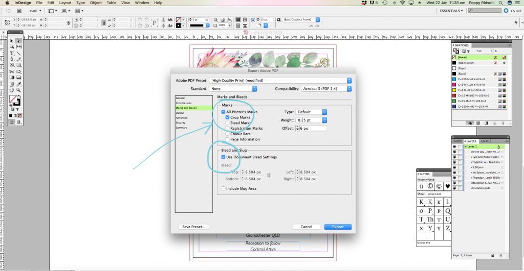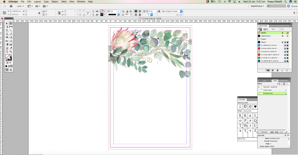 Open up a new file, the same size as your invitations will be when printed and trimmed. I use 120mmx180mm. You can then place the floral file in place. It will slightly overlap, due to the bleed, but this is ok, as the InDesign will have a bleed when saving.