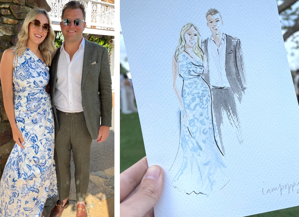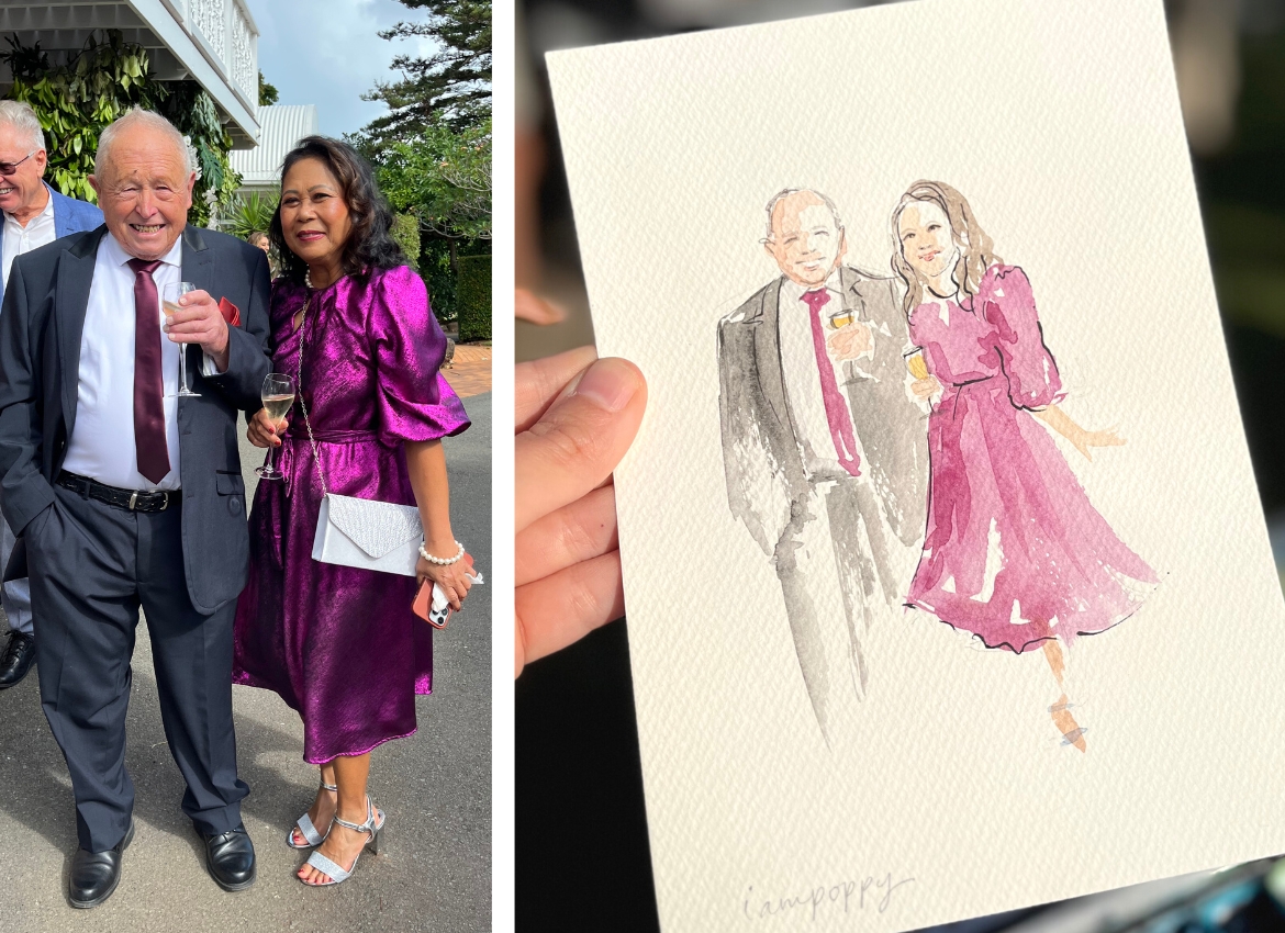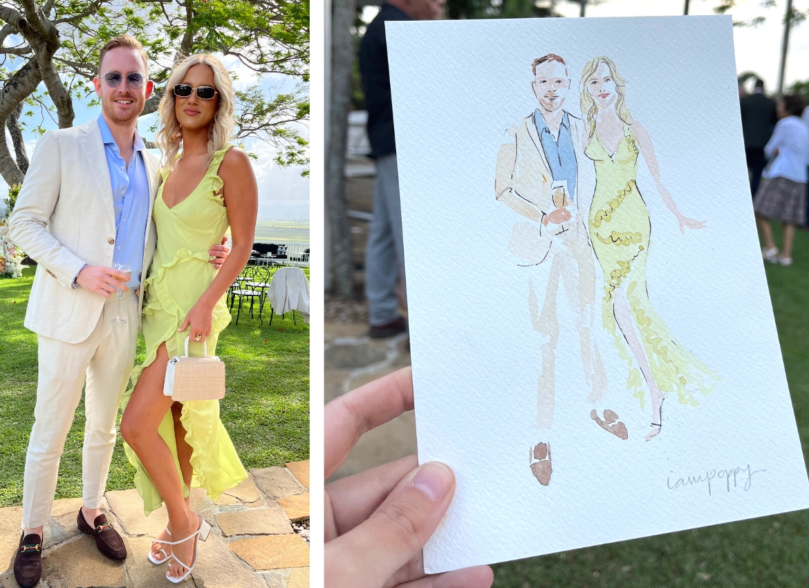 Well, first I go around and capture the main people in the wedding, like the grandparents, parents, brothers and sisters. I find them and make them pose for a photo, go back to my table and create little illustrations for them.