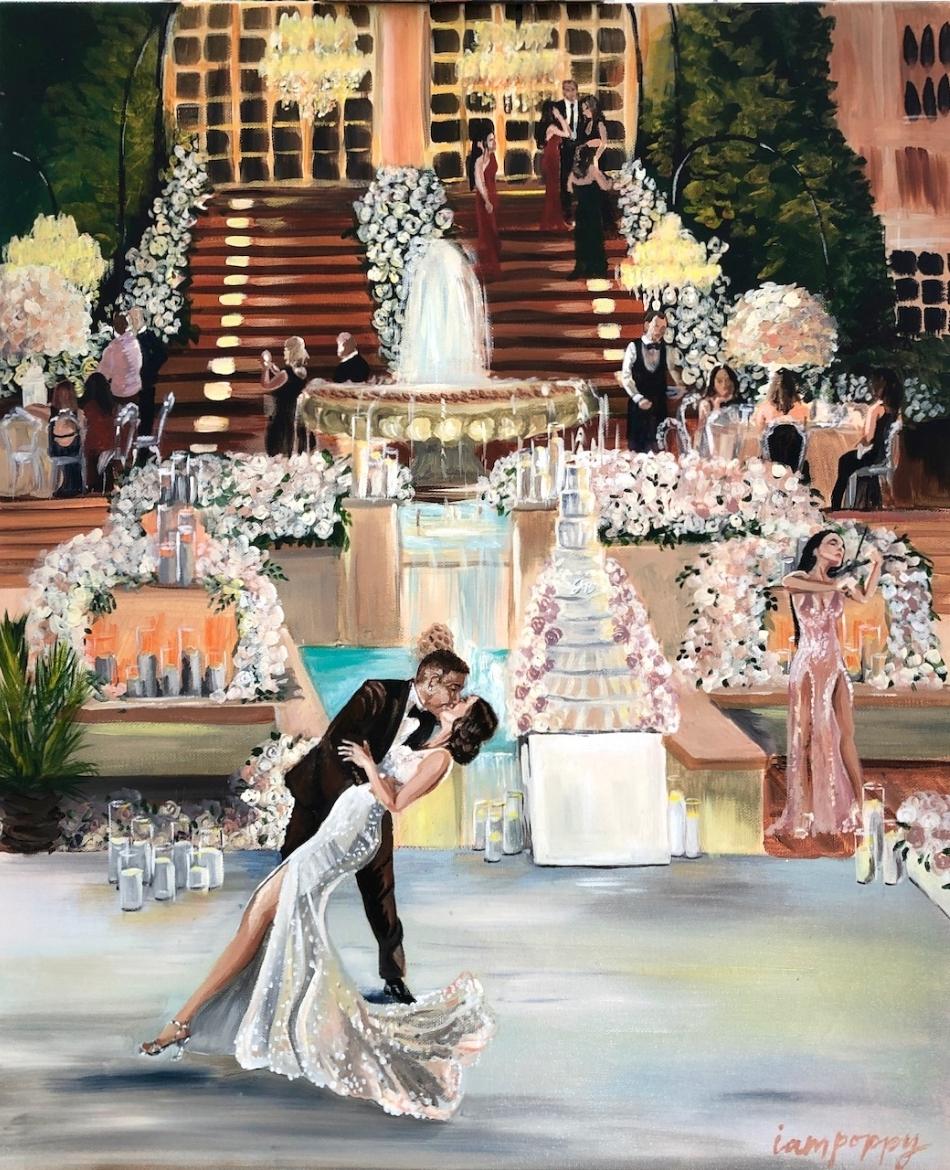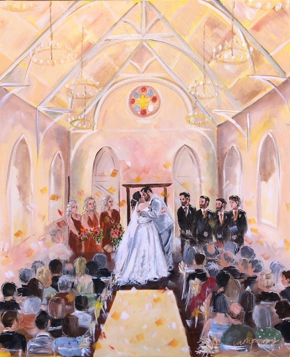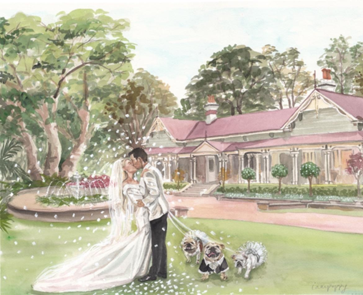 This wedding was stunning, and I painted the couple’s first kiss, but moved it out in front of the house so we could get the best of both worlds. I love it. I also added their cute dogs, who walked down the aisle too! Add a bit of confetti, and it’s love!