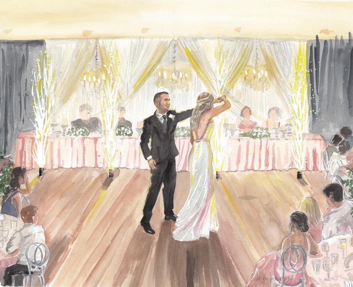 It was no mean feat to try and capture this on canvas, but I soldiered on and managed to whip something out of the bag. I am super pleased with this creation, it contains so many of the details from the night, with the main part being their first dance. Just lush!