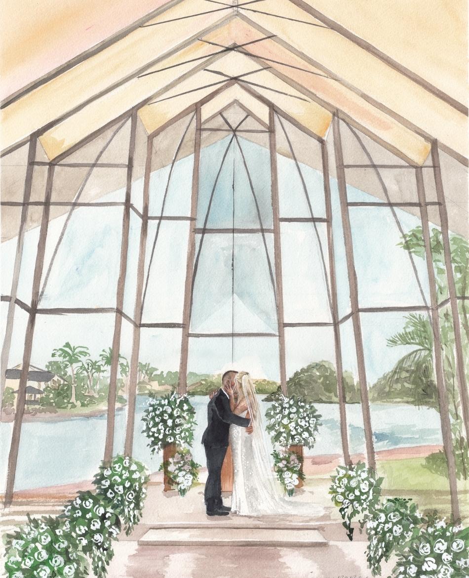 The ceremony was simple, yet beautiful in the stunning chapel which lent itself to focusing on the architecture and that great glass front. I kept it simple with a watercolour of the couple only, standing before the massive window.