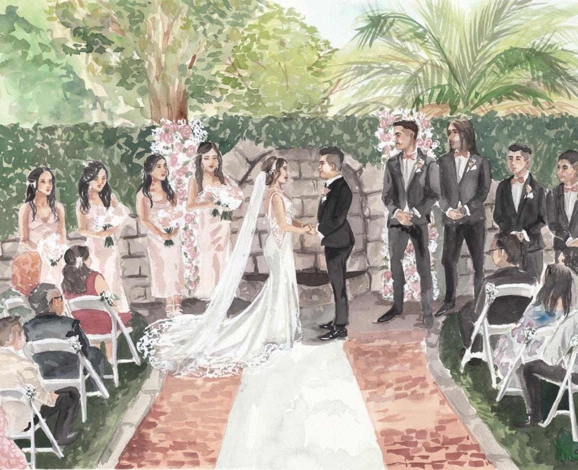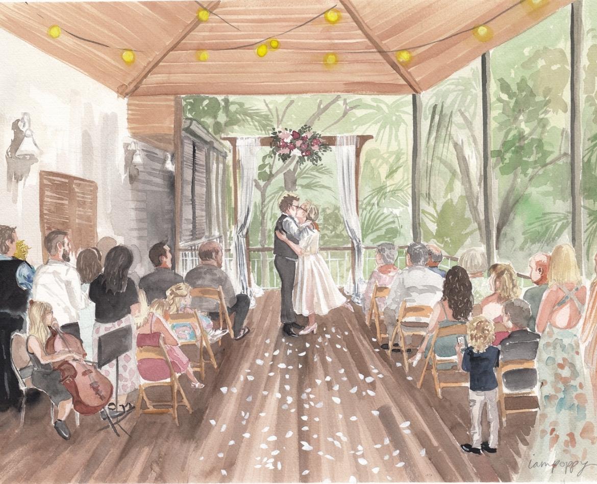As quickly as I was able to get there, I had to leave the bustling lights of Sydney behind. Off to the Sunshine Coast for a small and intimate wedding of Kelly and Jodie. This was such a beautiful ceremony, with such love and heartfelt stories of their romance. They had blended their children and created a great family unit together. I loved painting this wedding as everyone was so friendly and interested in the process. I captured their first kiss in watercolour, with as many guests as I could fit into the piece as possible.