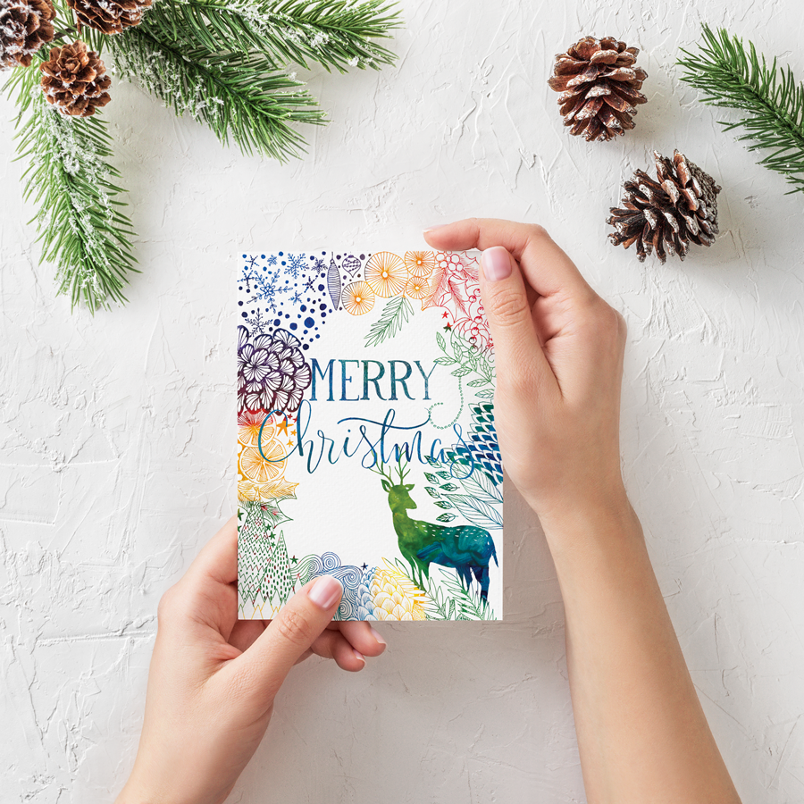 Working with linework and patterns, this gorgeous design showcases the stunning Christmas deer. Combined with Christmas colours and vibes, this is the perfect card to send your Christmas wishes.