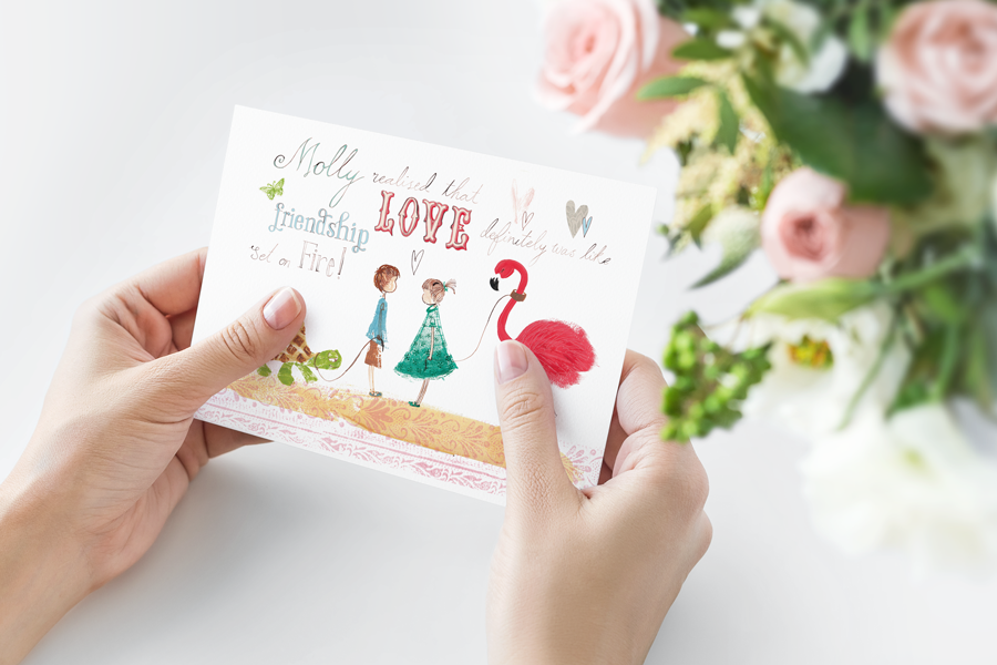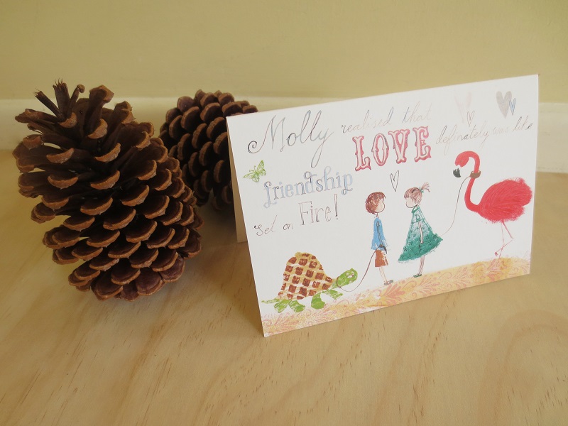 Send out your love with this cute and quirky Molly Love card. Featuring her pink flamingo, here she meets a fellow pet lover in Felix, and she discovers the love truly is like friendship set on fire!