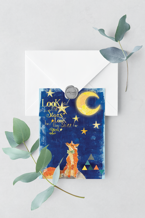 Barnaby’s Fox is a little orange fox enjoying the night sky. A beautiful card, featuring yellow Coldplay lyrics, “Look at the stars, look how they shine for you..” This card would be perfect for any birthday card, or just to let someone know they are special. Paint mixed with collage and hand written lettering, this card has a unique and personal feel to it that anyone would love to receive.