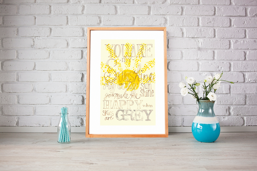 You are my Sunshine is a print designed for my mother. Being one of her favourite songs she shared with a special person, I wanted to create a lasting memory piece for her. It seems as though many people have a special story for this song, making this one of my most popular pieces for all ages. Nothing brightens up a bad day more than this simple verse from the song You are my Sunshine. Ideal as a gift for any occasion, or as a treat to brighten up your day.