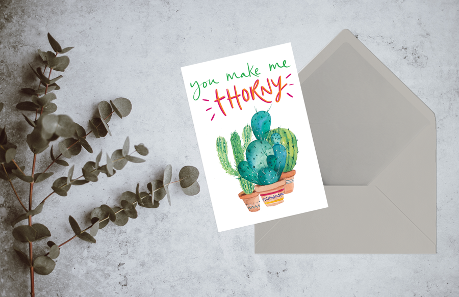 You make my tHorny! Sometimes the romantic card just doesn’t cut it! but this card does! its a fun and slightly naughty play on words, teamed with an awesome watercolour cactus painting… perfect for gifting your loved one this year.