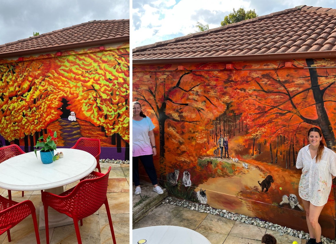 IMAGE: A mural before and after. The mural on the left was painted for this homeowner in Memorium of her pet. She engaged myself and another artist to re-do the mural with a more realistic and dimensional view.
