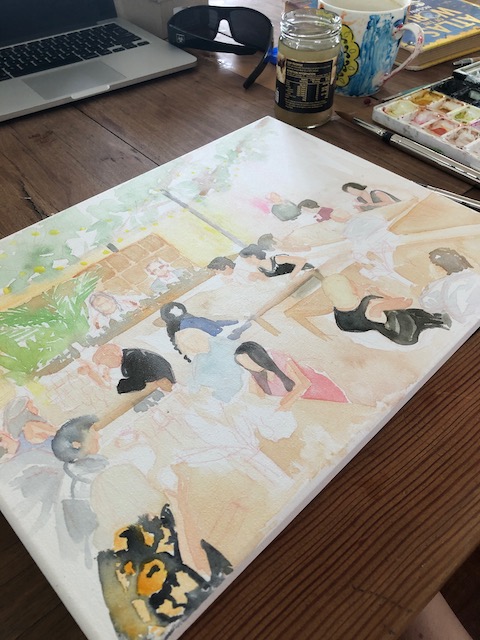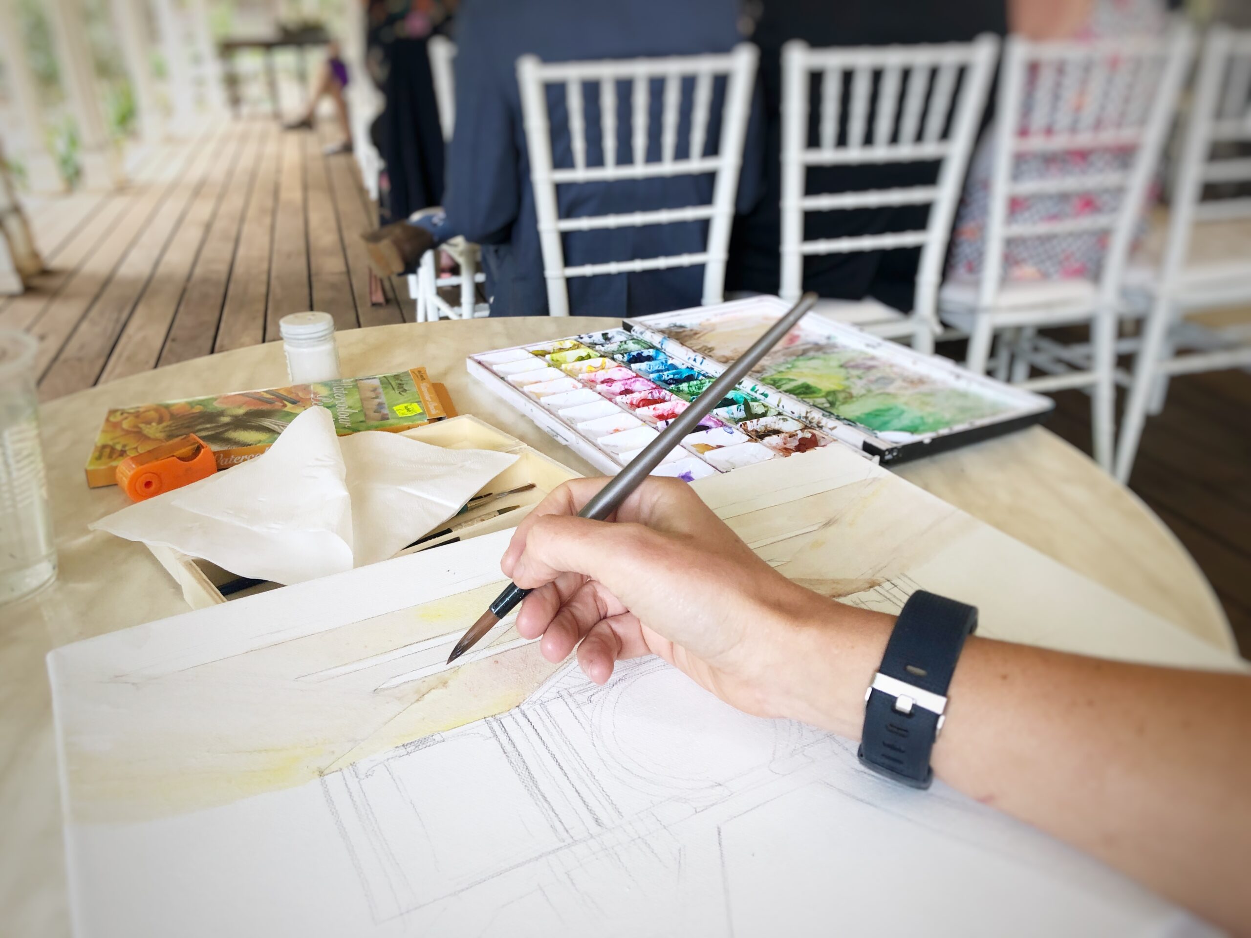 Every live painting session is like a new adventure! To begin, I start by setting up my space, ensuring I have all the essentials at hand: high-quality watercolor paper backed onto a wooden board, a watercolor palette with my favorite colors, brushes of various sizes, and, of course, my trusty water container. Moreover, creating a comfortable environment is key, as it allows me to focus entirely on the art. Therefore, making sure I’m not in direct sun or too cold also comes into it. I try and set up undercover at the canapé area, or even in the reception to make sure I’m not out in the Australian elements for too long.Â